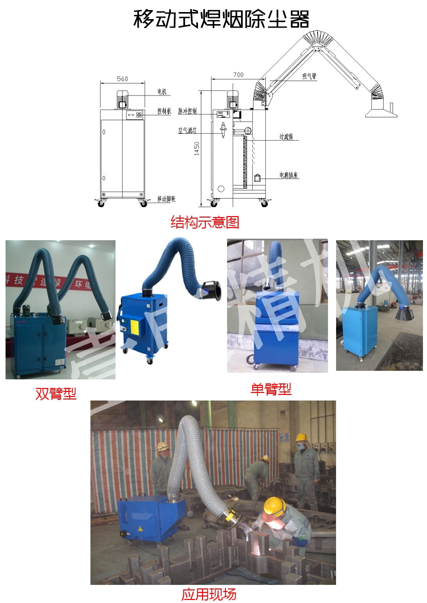 用于焊接、拋光、切割、打磨等工序中產(chǎn)生煙塵和粉塵的凈化以及對稀有金屬、貴重物料的回收等,可凈化大量懸浮在空氣中對人體有害的細小金屬顆粒。具有凈化效率高、噪聲低、使用靈活、占地面積小等特點。適用于電弧焊、二氧化碳保護焊、MAG焊接、碳弧氣刨焊、氣熔割、特殊焊接等產(chǎn)生煙氣的作業(yè)場所。