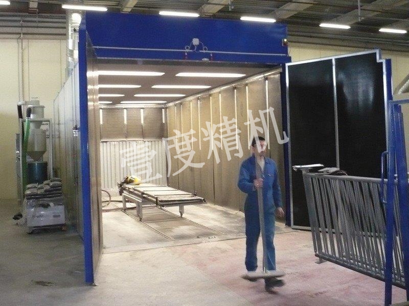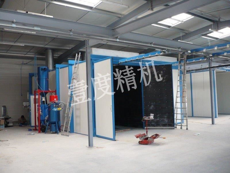 簡易噴砂房工作原理:是指采用壓入式噴丸原理,把丸料(鋼丸、鋼砂、剛玉或玻璃珠)以很高的速度和一定的角度噴射到工作表面上,讓丸料沖擊工作表面,達到清理目的。工件可通過人工搬入噴砂房內(nèi)部,也可以通過臺車運載自動進入噴砂房內(nèi)部,在噴砂房內(nèi)部可固定不動,也可升降吊起,或進行旋轉(zhuǎn)等配合噴丸清理。需人工佩戴防護器具,進入噴砂房內(nèi)手持噴槍對工件加工,噴出的丸料散落在噴砂房體地面上,需人工清掃回收,再將磨料倒回加壓罐內(nèi)循環(huán)使用。簡易噴砂房主要是指磨料為人工回收方式,噴丸清理為人工操作。